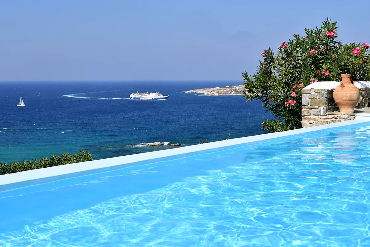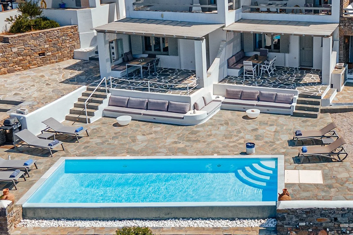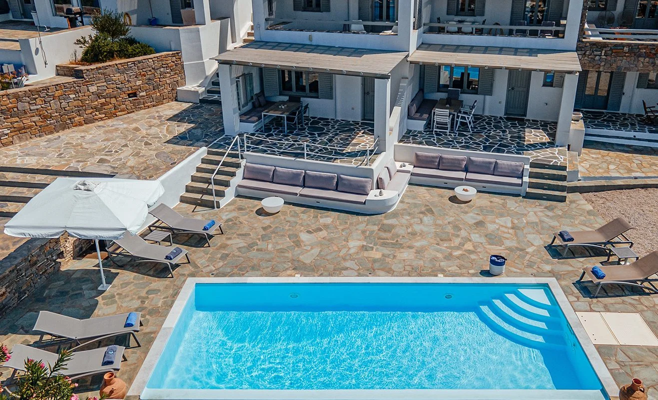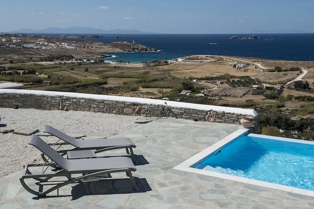The common swimming pool of 3,5×8,5 metres is 4 steps below the terrace. The spacious terraces of 110 sq.m. offer all that is needed for the guests to enjoy the astonishing