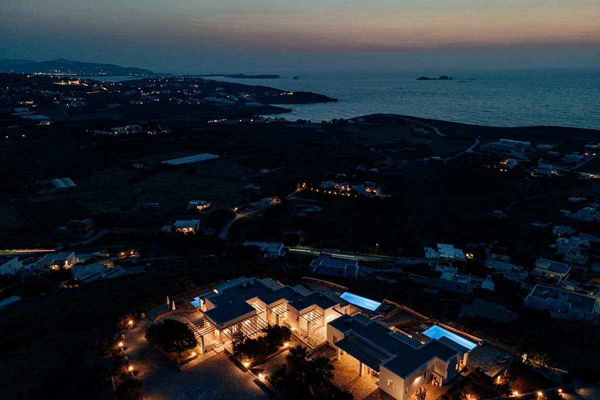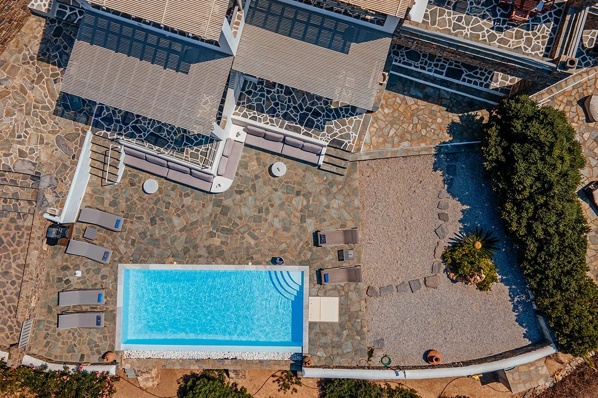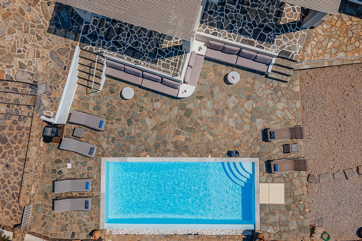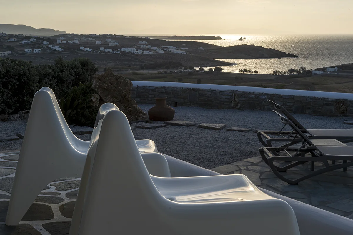 Its spacious area of private terraces, dining and lounge ares are furnished for guests every need. The 3,5×8,5 metres swimming pool is also used by the adjoining house FOS, and the pool area is ideal for relaxation and enjoyment of the spectacular sunsets.
