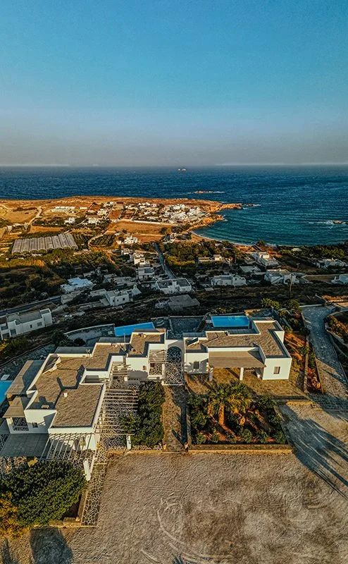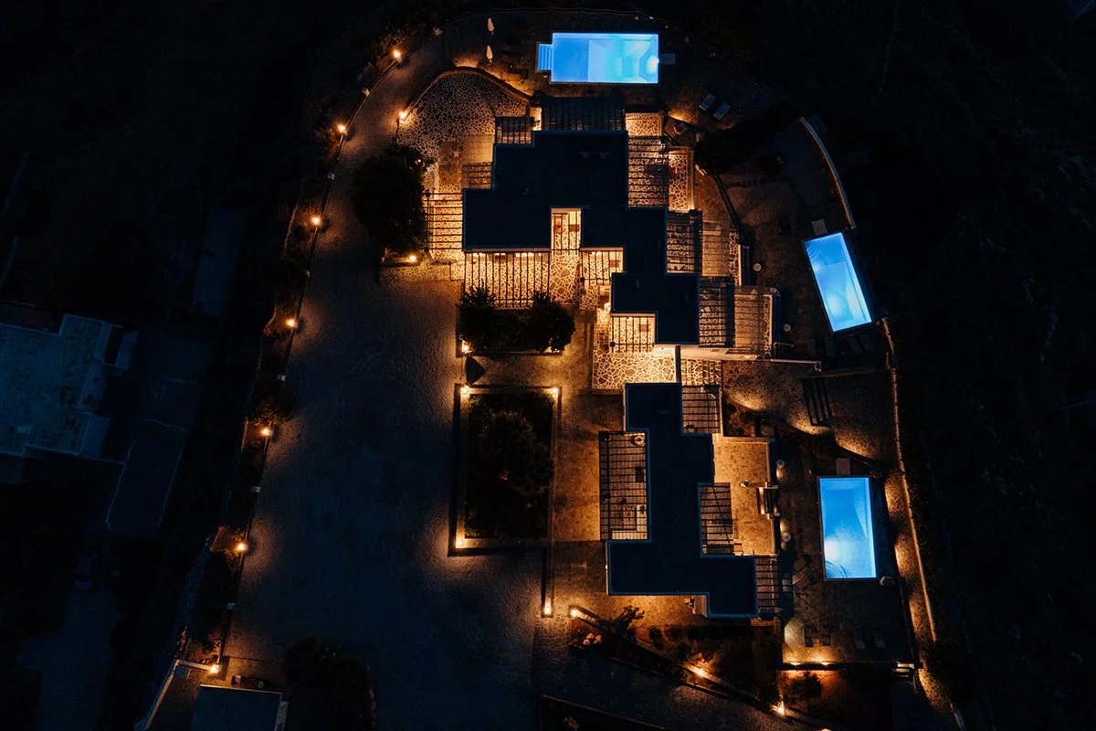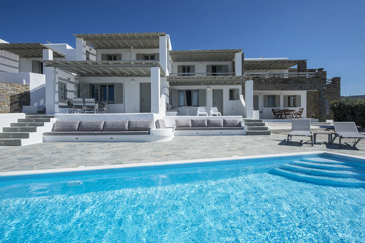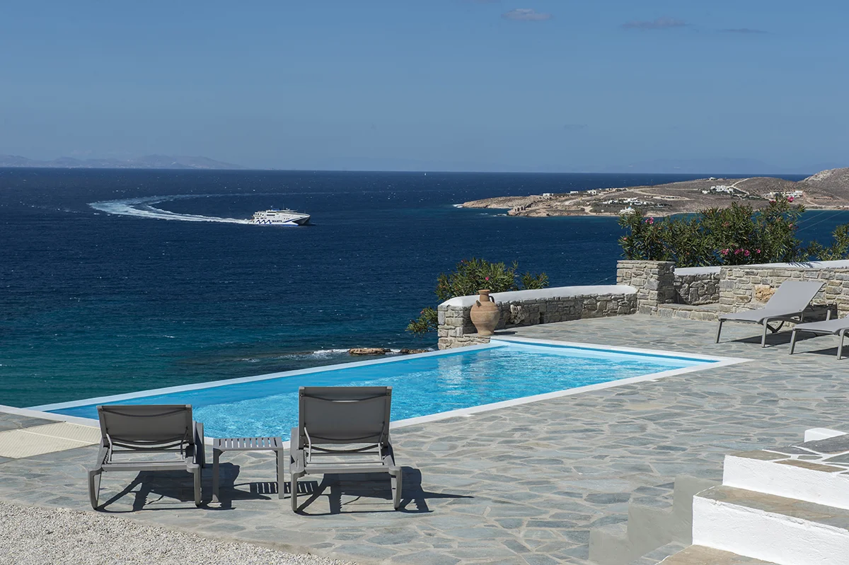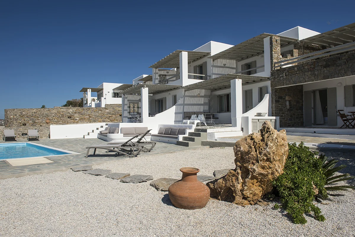 Its spacious area of private terraces, dining and lounge ares are furnished for guests every need. The 3,5×8,5 metres swimming pool is also used by the adjoining house FOS, and the pool area is ideal for relaxation and enjoyment of the spectacular sunsets.