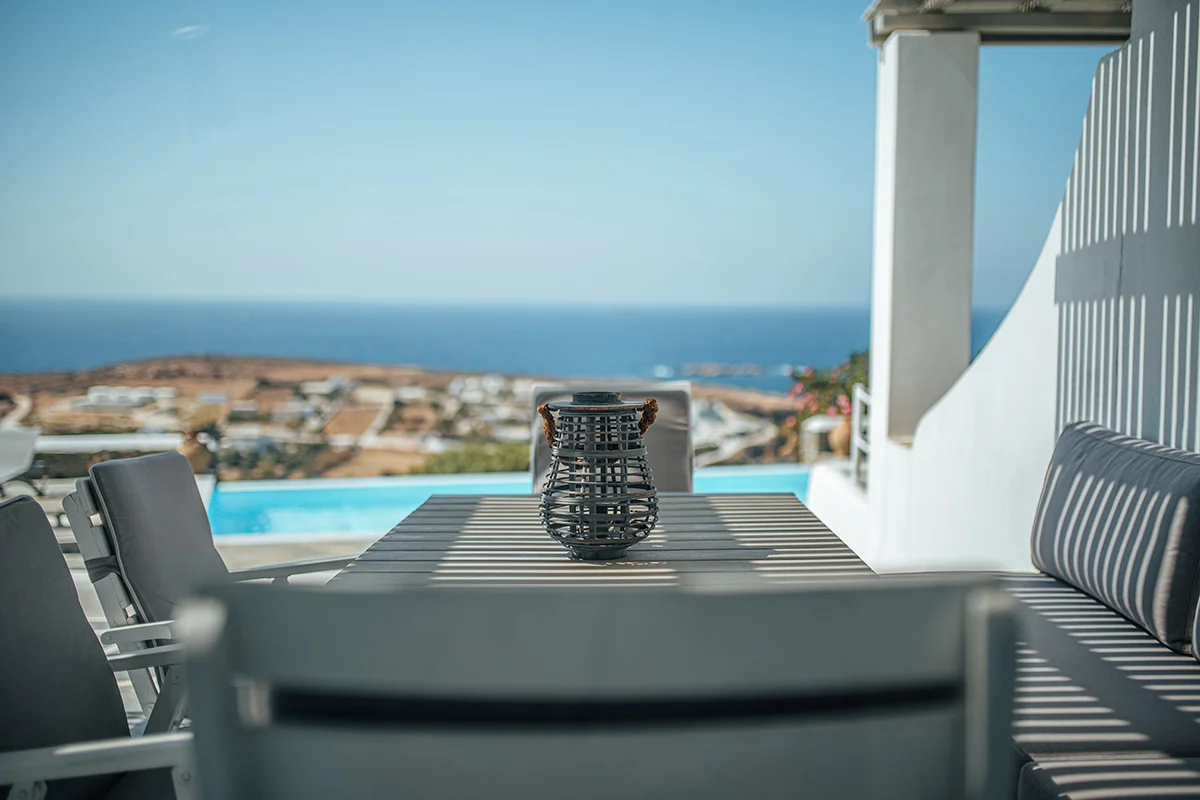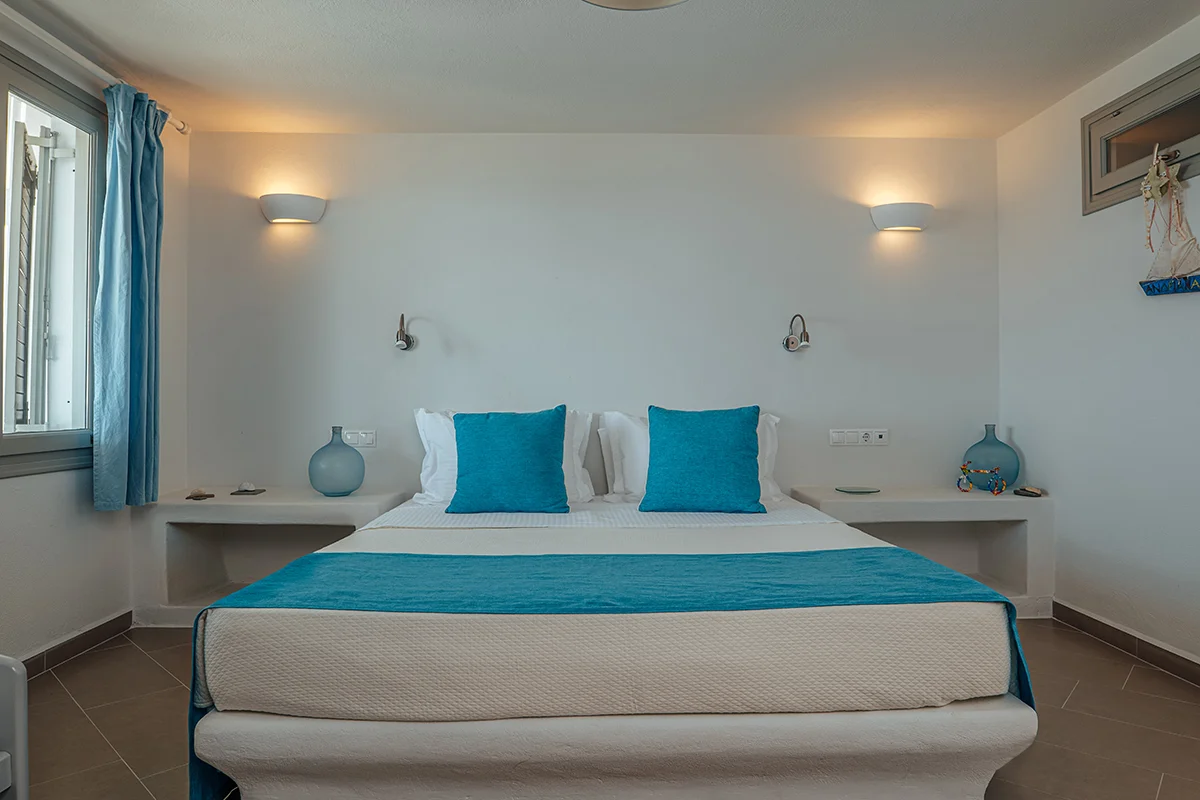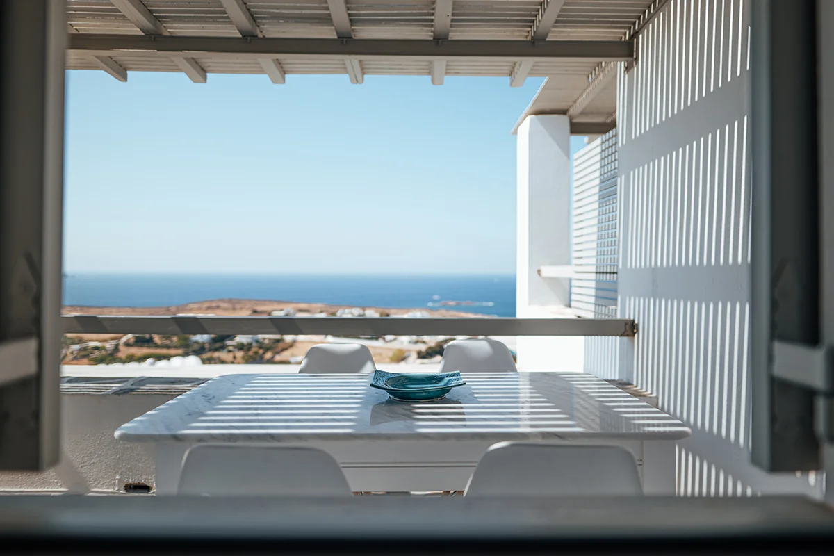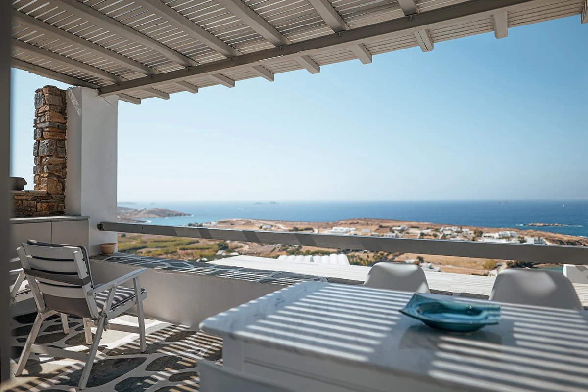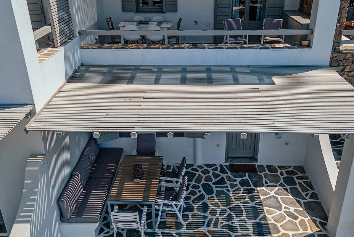 The stairway leads to the lower level where there is the master bedroom with king size bed and en suite facilities and access to a private veranda. The bedroom offers A/C, flat TV, WiFi. Off the bedroom, you find a private veranda with dining area for 8 guests and with stunning views to the Aegean, to the port of Parikia and swimming pool.