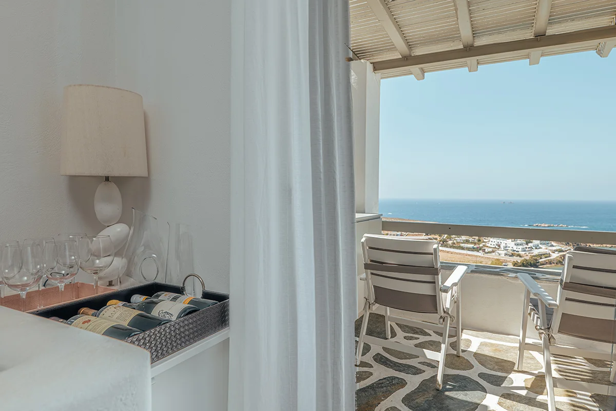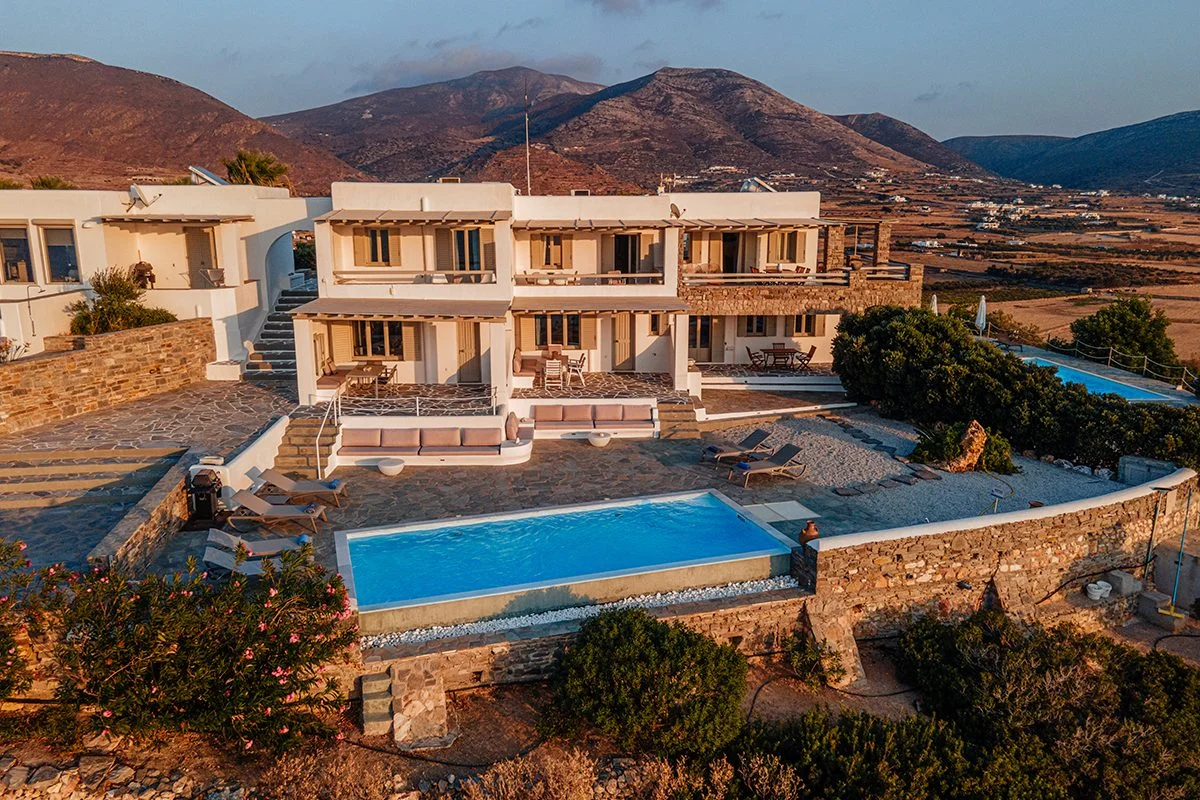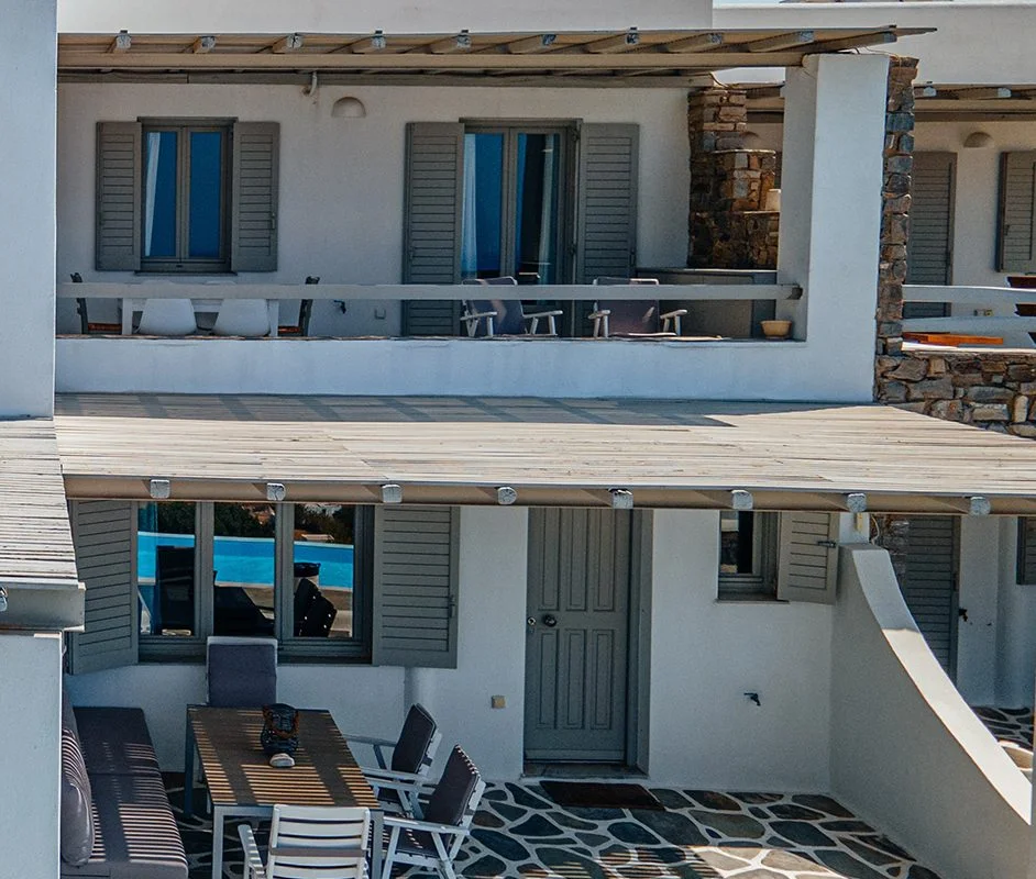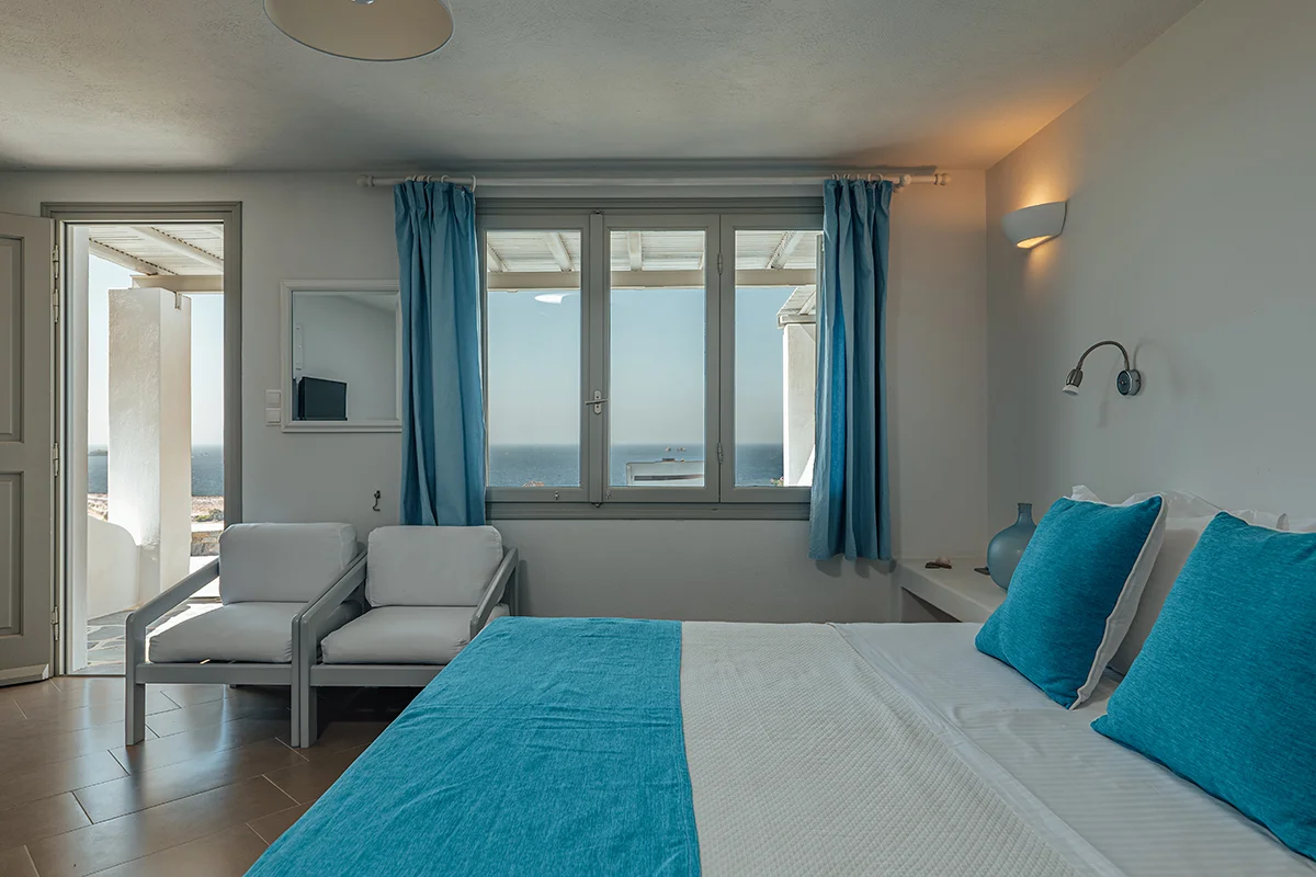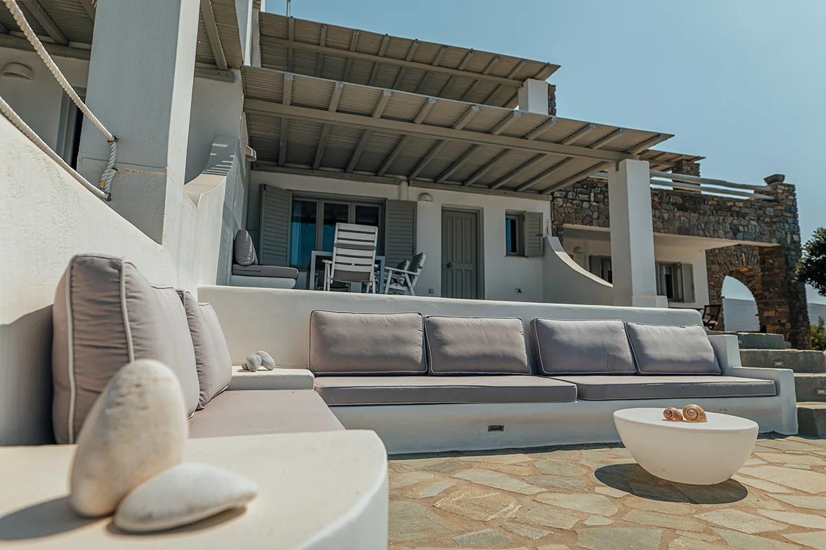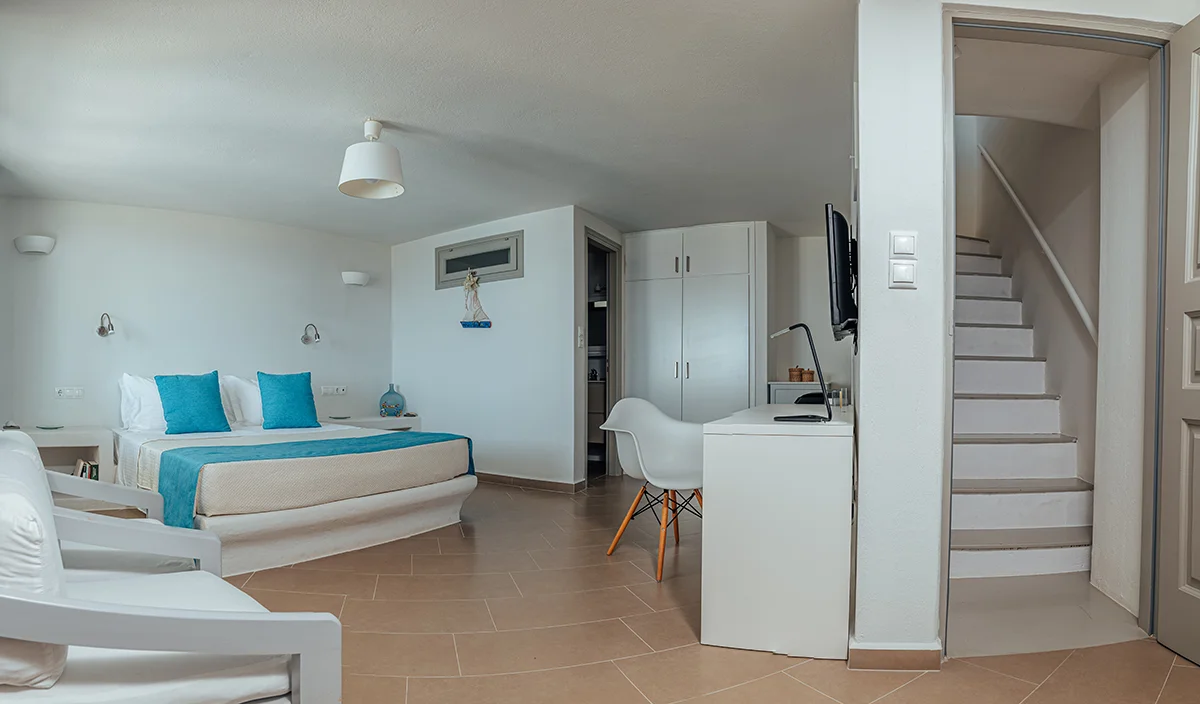 The stairway leads to the lower level where there is the master bedroom with king size bed and en suite facilities and access to a private veranda. The bedroom offers A/C, flat TV, WiFi. Off the bedroom, you find a private veranda with dining area for 8 guests and with stunning views to the Aegean, to the port of Parikia and swimming pool.