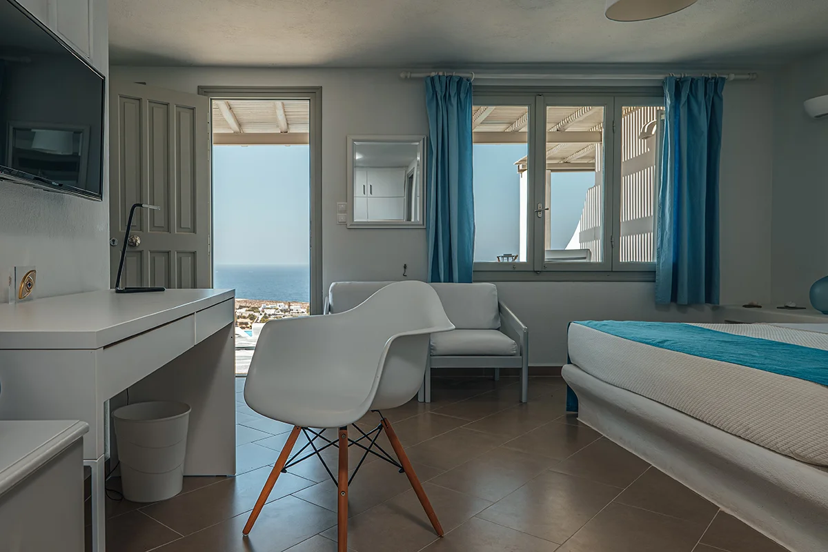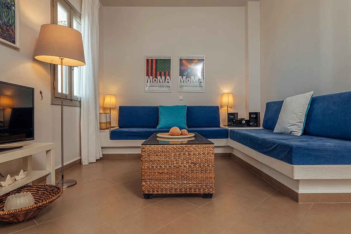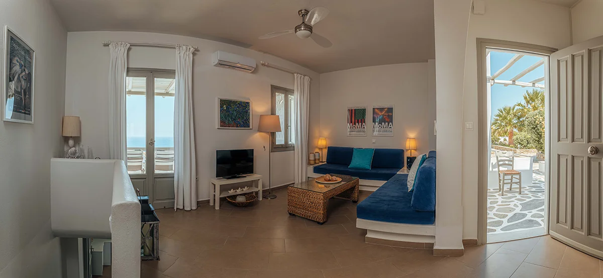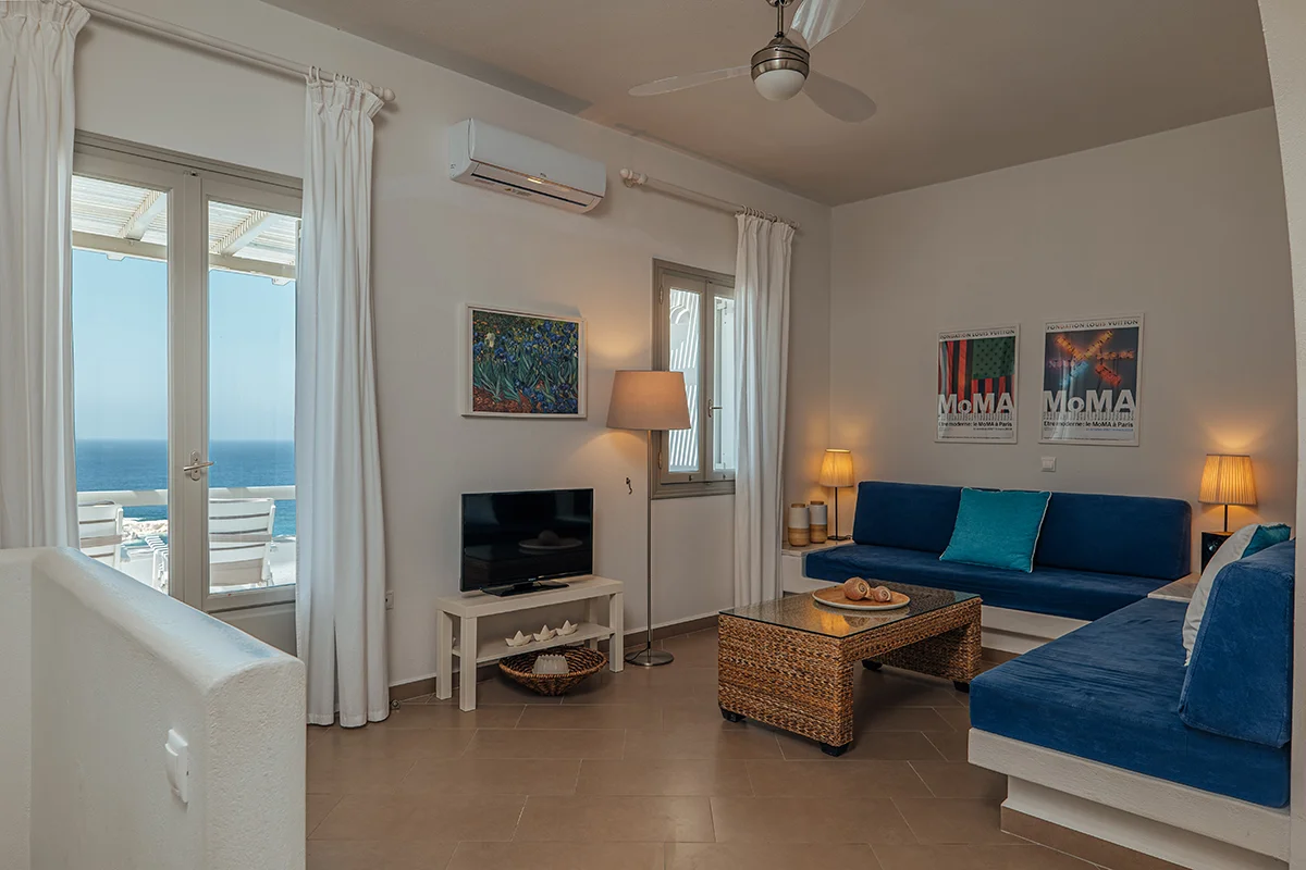 ANEMOS retreat lays on two levels. The upper level, enters from the parking leading to a spacious living room, open plan fully equipped kitchen with guest bathroom with shower and access to a private veranda with sea views. The living room is amply furnished and has ceiling fan, flat TV and HI-FI.